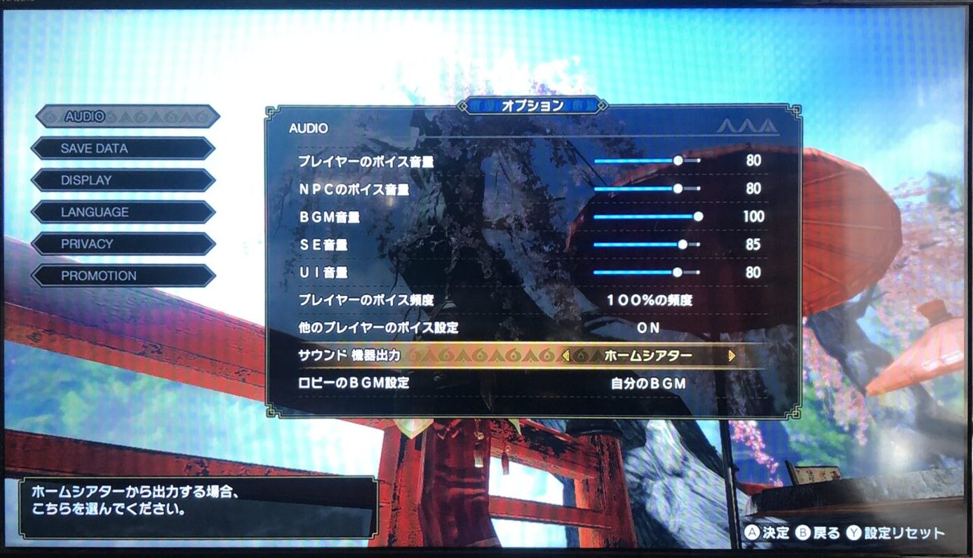 モンハンライズ「本体」のホームシアター向けサウンド設定の方法を解説します。
